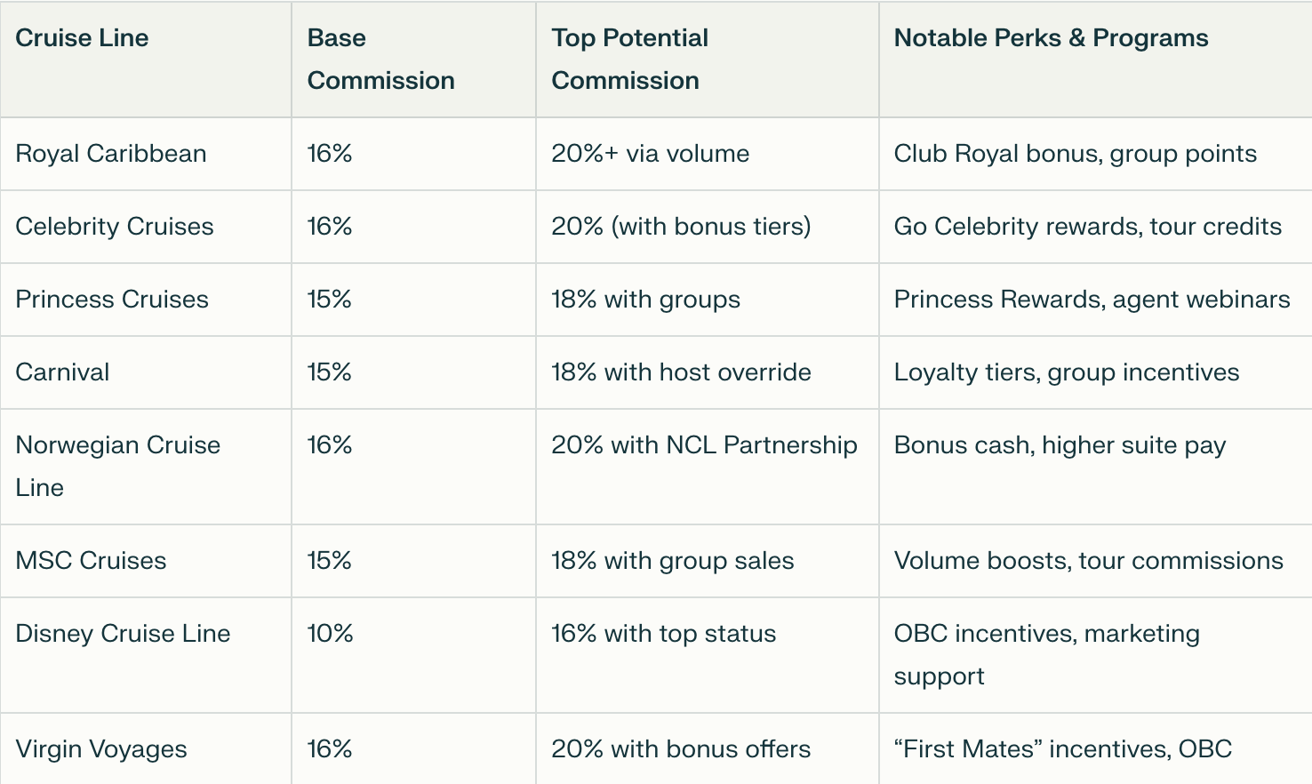 Cruise LineBase CommissionTop Potential CommissionNotable Perks & Programs
